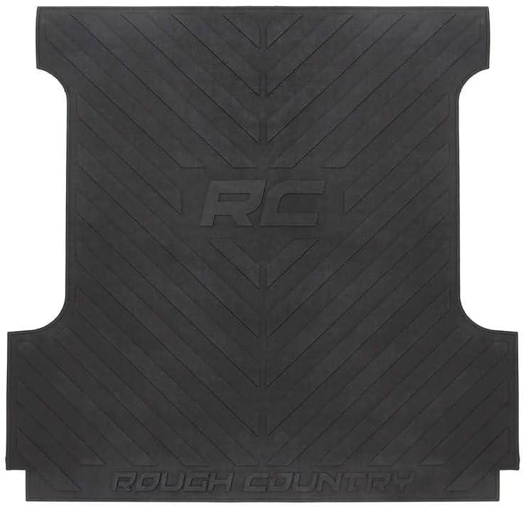Innovative Design and Material. Keep your truck bed free from scuffs, scrapes, and scratches with Rough Country Truck Bed Mats. These heavy-duty, 3/8-inch thick, contoured rubber mats are nearly indestructible; made from a high-quality rubber compound that won’t crack in extreme temperatures or fade when exposed to the sun. This stylized bed mat features a large “”RC”” and “”Rough Country”” logo with angled lines for an improved look that also protects your truck bed.