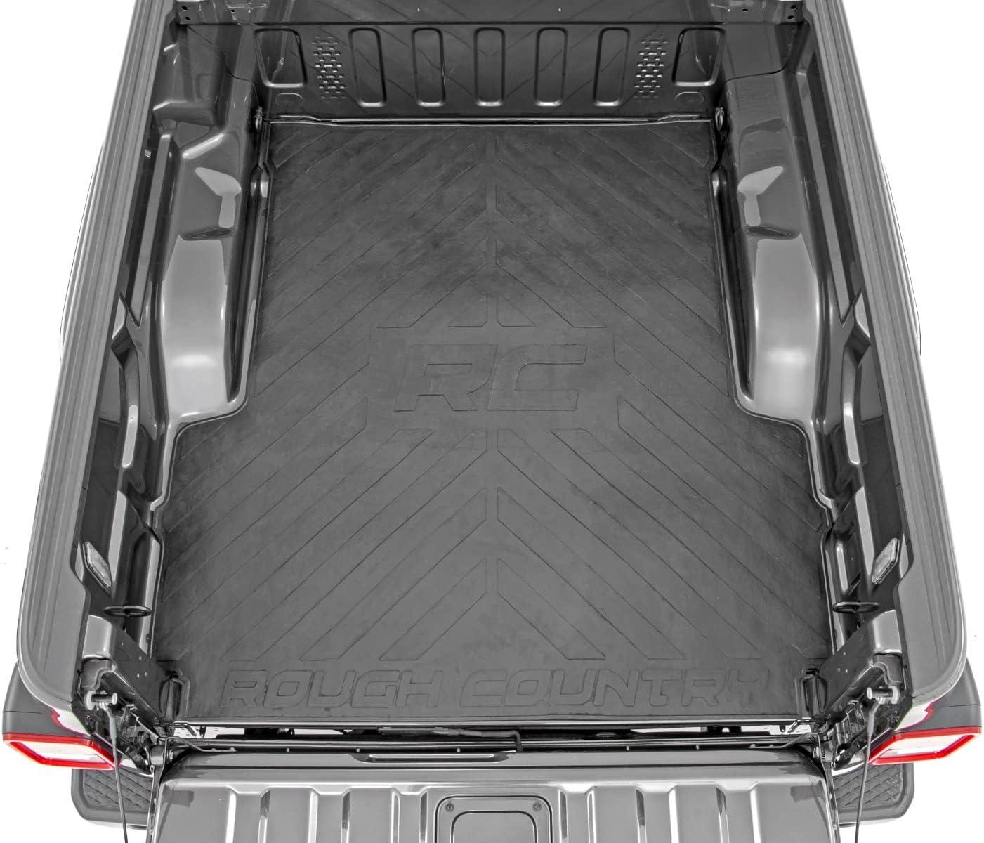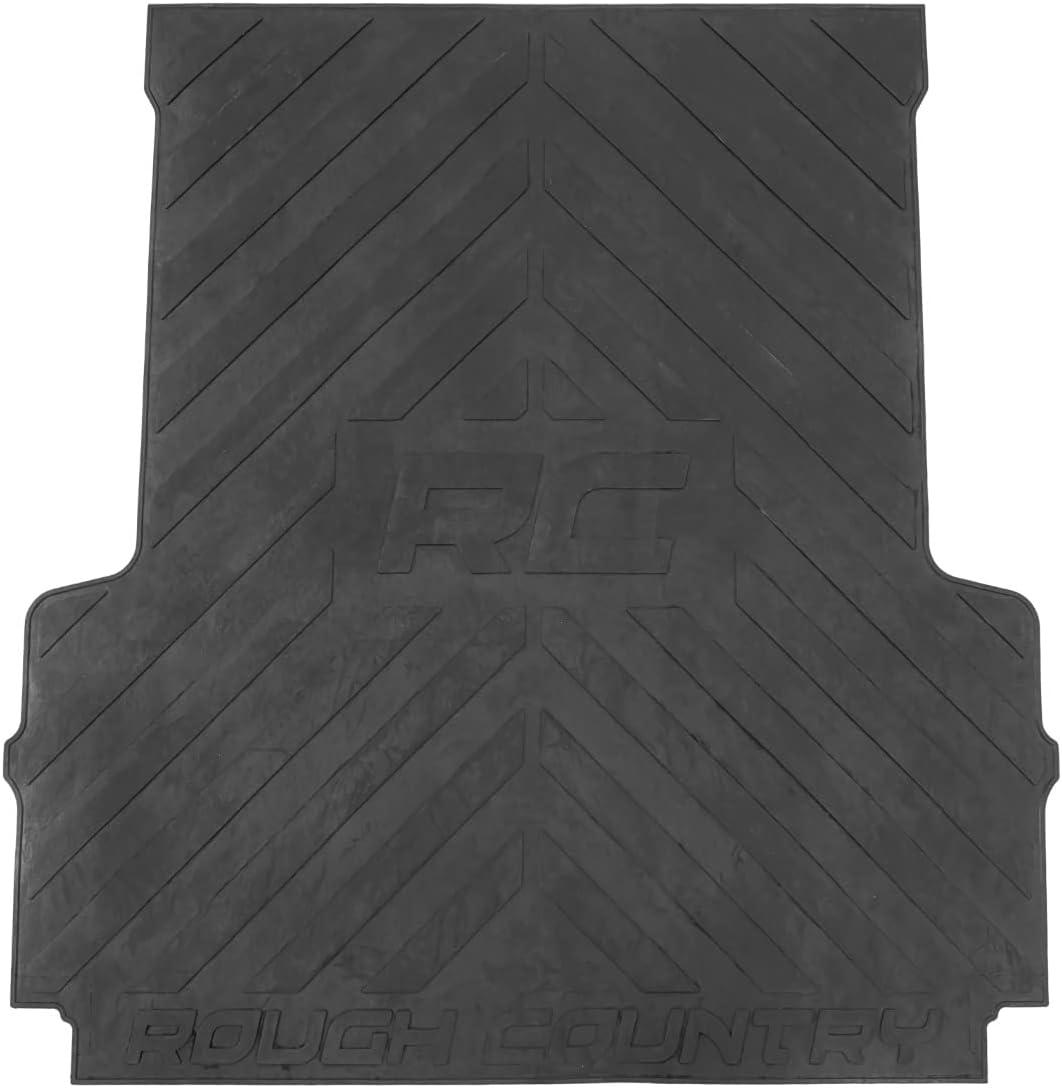 Innovative Design and Material. Keep your truck bed free from scuffs, scrapes, and scratches with Rough Country Truck Bed Mats. These heavy-duty, 3/8-inch thick, contoured rubber mats are nearly indestructible; made from a high-quality rubber compound that won’t crack in extreme temperatures or fade when exposed to the sun. This stylized bed mat features a large “”RC”” and “”Rough Country”” logo with angled lines for an improved look that also protects your truck bed.