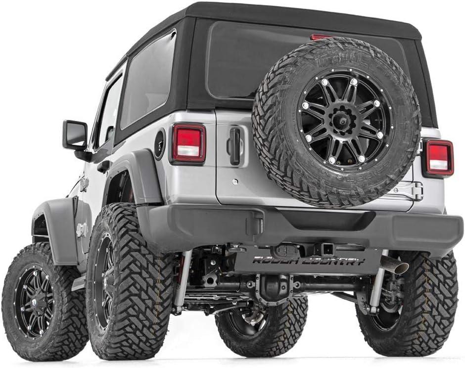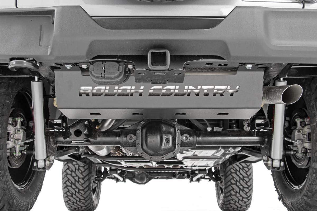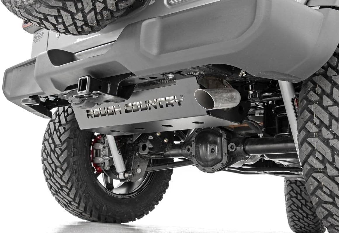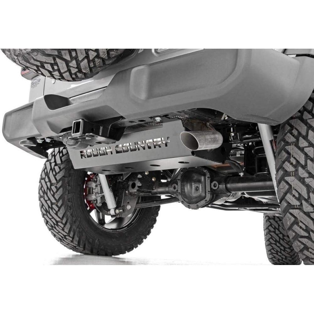 Protect your JLs Muffler from off-road hazards with Rough Country's Muffler Skid Plate. This durable, 3/16 plate steel skid helps to protect your muffler from rocks, debris and anything else you can throw at it! The Jeep JLs exposed muffler is a vulnerable weak-spot when rock crawling or traversing uneven terrain. Fortify this area with a layer of plate steel protection and gain incredible peace of mind on your next trip out on the trails! This easy upgrade looks great, too, featuring a laser-cut Rough Country logo with an angled design and port holes for proper airflow and heat dissipation. With a 100% bolt-on installation procedure, this upgrade is easy to install as well, and features Rough Country's Limited Lifetime Warranty.