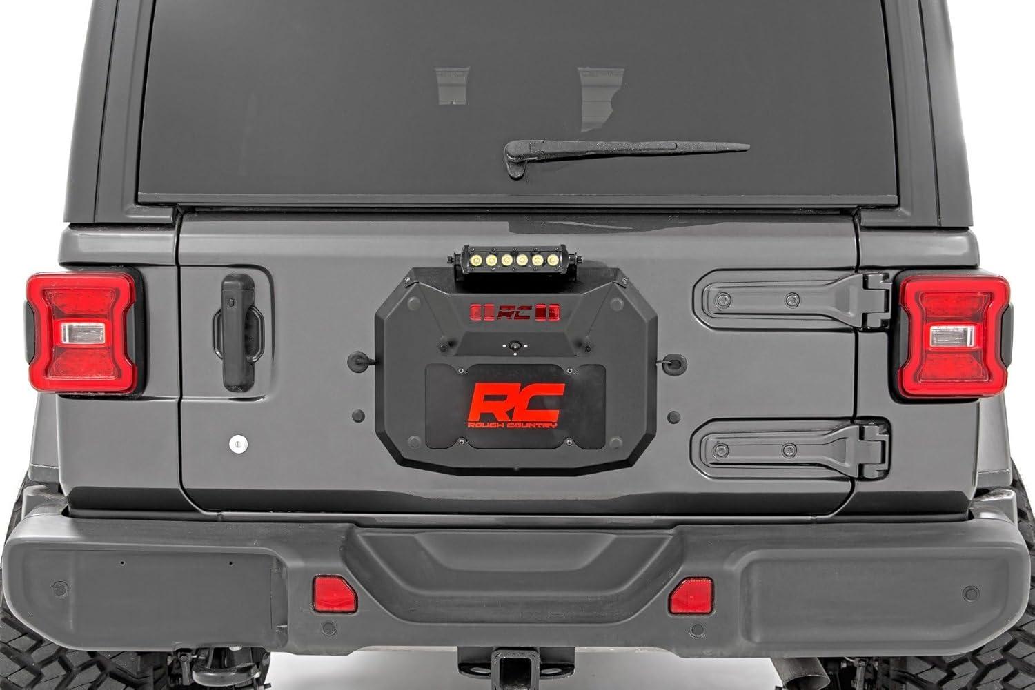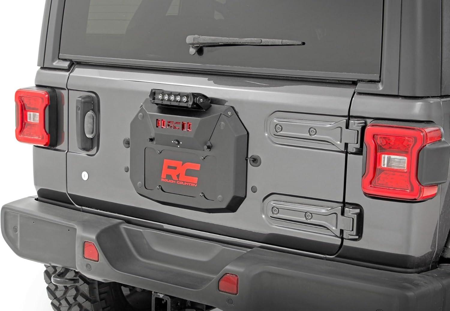 Delete your spare tire while dressing up the rear of your Jeep JL with Rough Country’s Spare Tire Delete Kit. This handy kit replaces the spare tire carrier with an aggressive-looking cover plate that houses your license plate, backup camera, and 3rd brake light. This solution also includes the ability to mount an optional rear-facing LED light bar for increased illumination.Buying a 5th tire and wheel gets expensive, and many aftermarket tires and wheels are simply too large to use on a rear tire carrier. Delete your spare tire and improve the look of this now visible area with this easy to install product! This easy-to-install upgrade features a 100% bolt-on installation process for an easy upgrade! Each Vent Cover is laser-cut and powdercoated black for a precise fit and a long lasting lifespan of good looks. Includes a lifetime replacement warranty!
