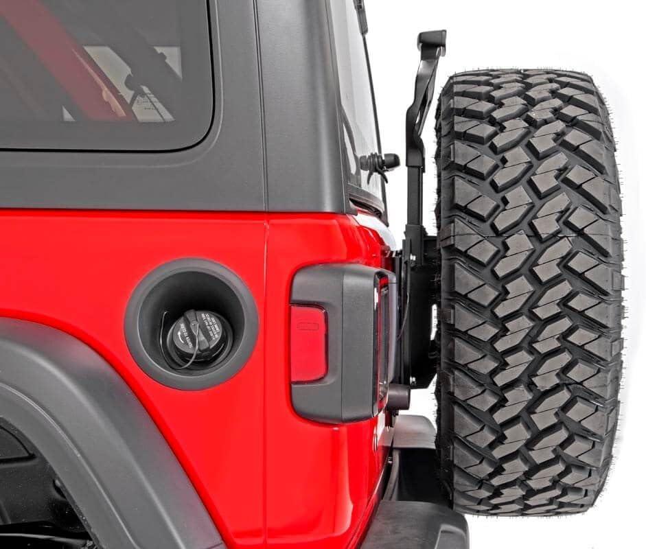 Gain enough clearance to run a 35×12.50 spare tire with Rough Country's JL Spare Tire Carrier Relocation Bracket! In the factory position, the JL is unable to mount a 35″ spare tire due to inadequate clearance over the factory bumper. This durable, easy-to-install mount relocates the factory spare tire assembly upwards by 2.25″, allowing you to easily clear a 35″ aftermarket spare tire above your factory rear bumper. Rough Country's JL Spare Tire Carrier Relocation Bracket succeeds where simpler solutions fail; engineered as a solid-steel, one-piece plate for the ultimate in durability and strength when it comes to holding the weight of your spare tire and wheel. This innovative design bolts directly into the factory mounting points and includes all the necessary components to relocate your entire spare tire assembly upwards with no need for drilling, welding, or additional modifications. Includes Rough Country's Lifetime Replacement Guarantee!