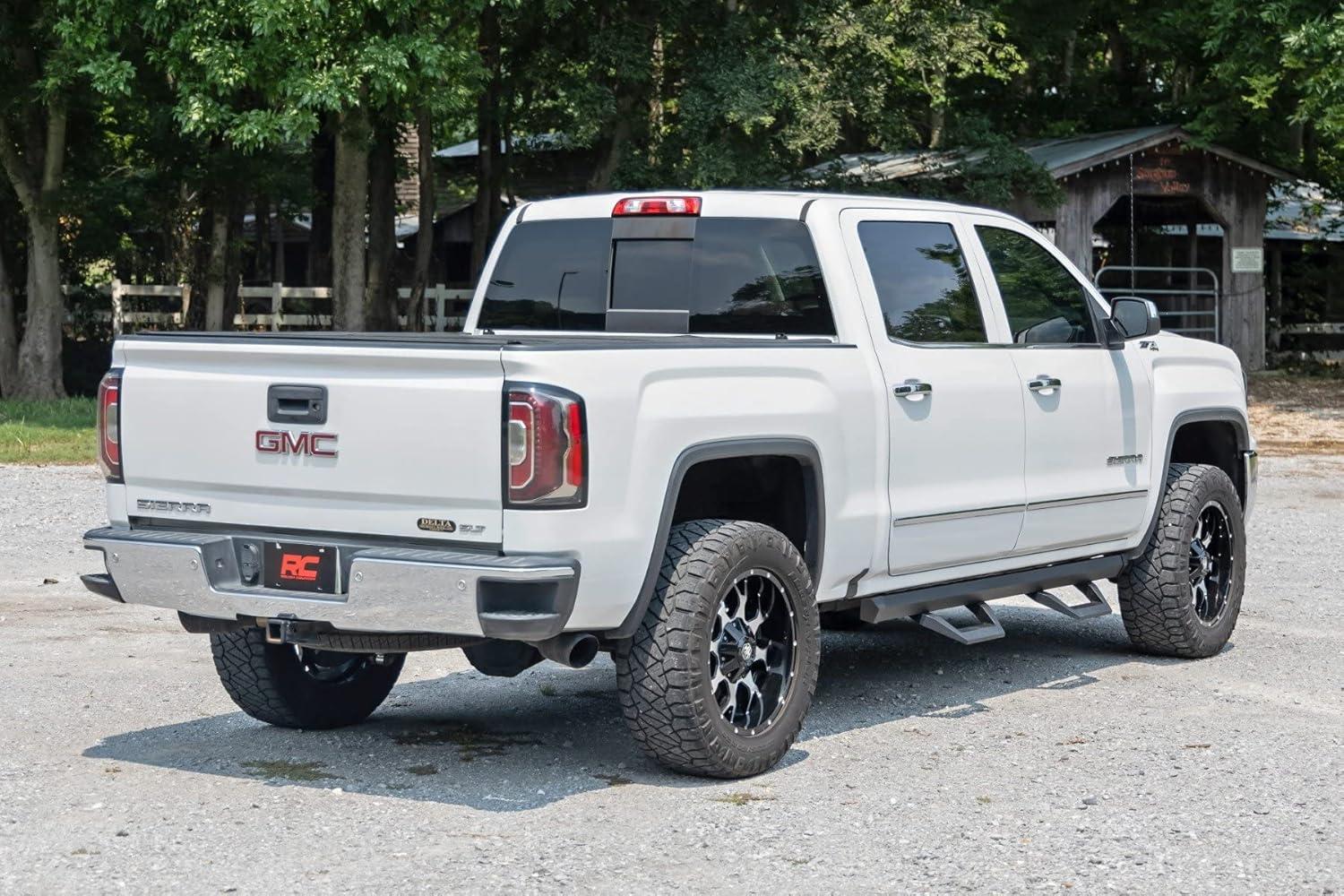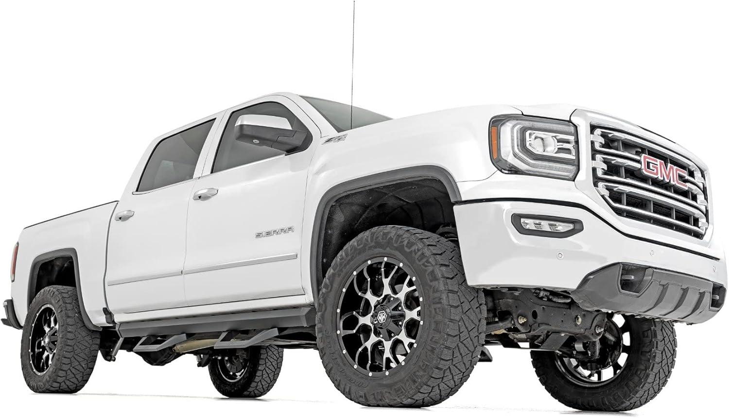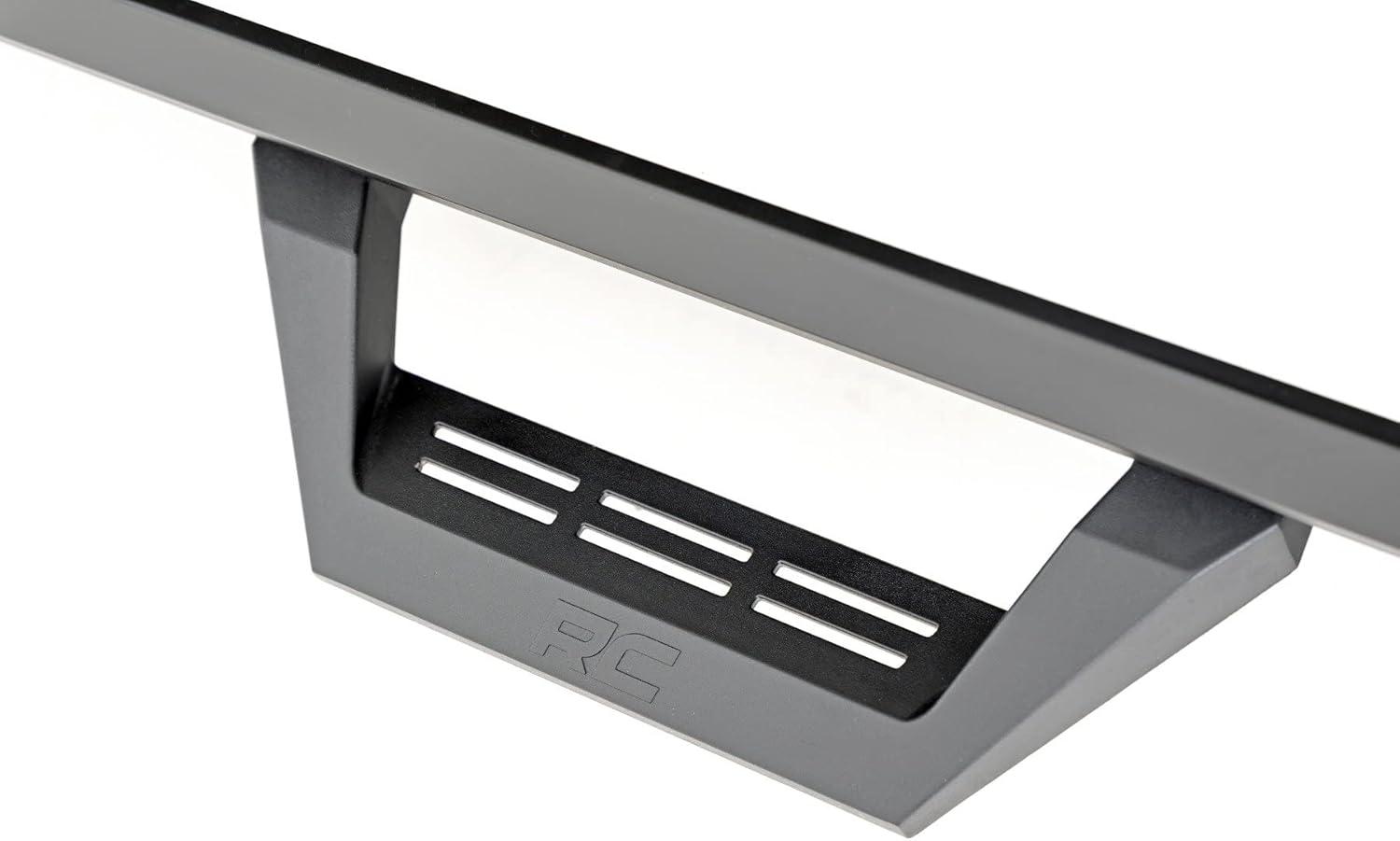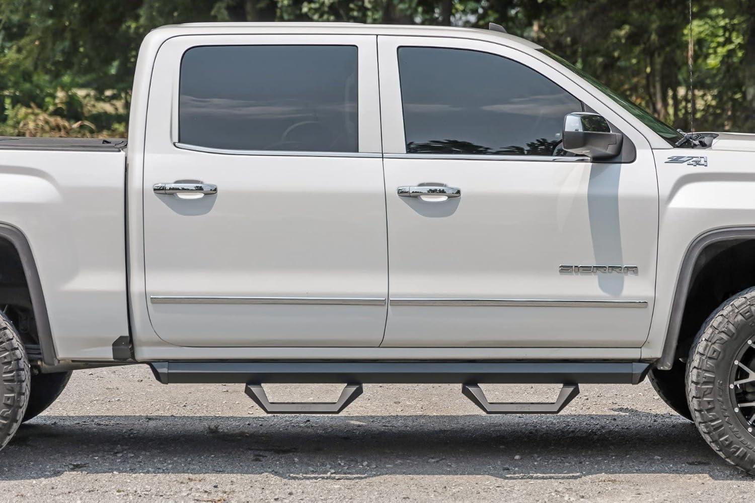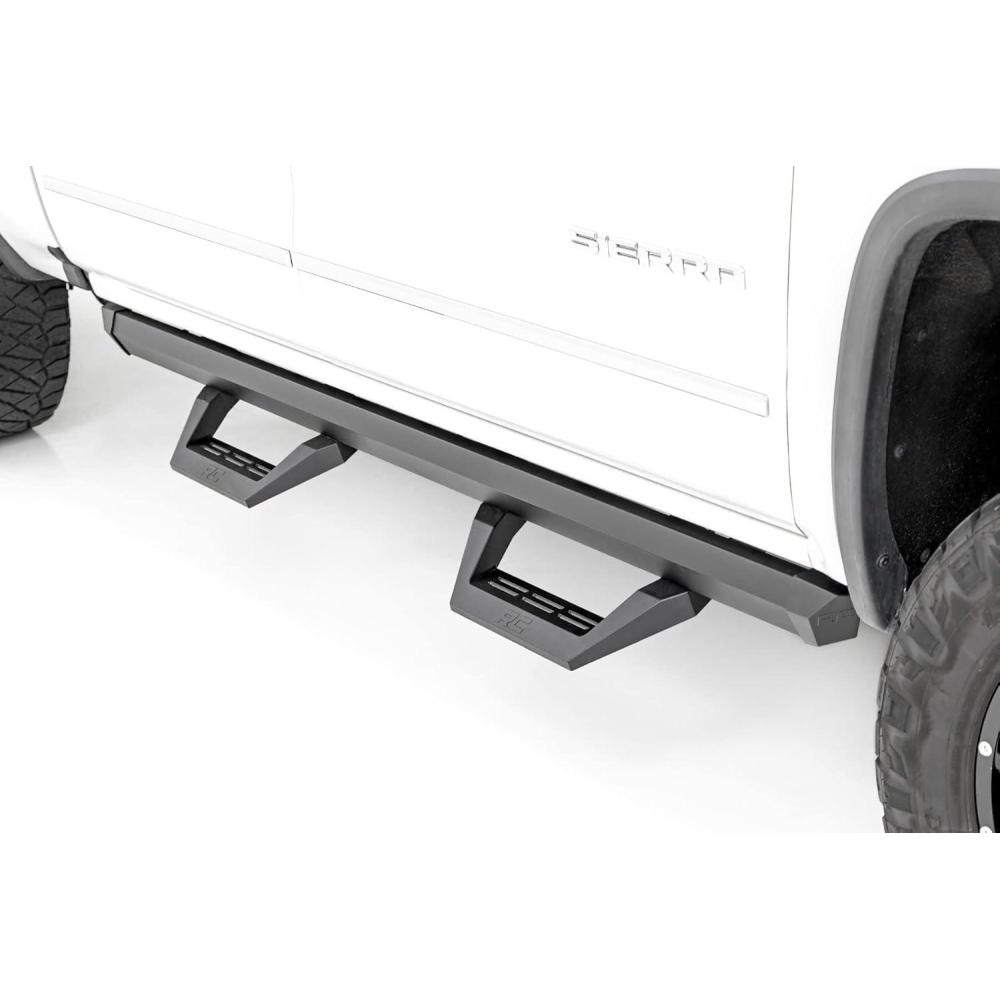 Upgrade your SIlverado or Sierra with Rough Country’s SRX2 Aluminum Side Steps, the perfect blend of innovative functionality and rugged style. Featuring a unique slotted rail system, these cast aluminum hoop steps are fully adjustable, allowing you to slide the footpad left or right for the perfect position to hop in and out of your lifted truck. Built from premium aluminum with a durable flat black powder-coated finish, these steps are designed to resist rust and wear, ensuring long-lasting performance both on and off the road. Not only do they enhance functionality, but they also improve your truck’s aesthetics by concealing unsightly body pinch welds and frame components.
