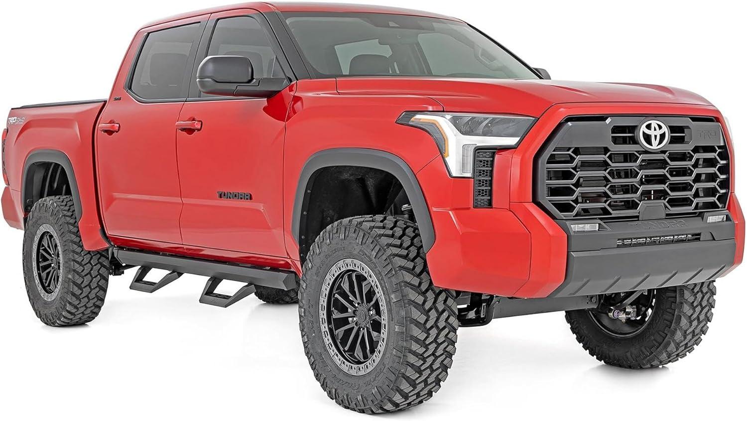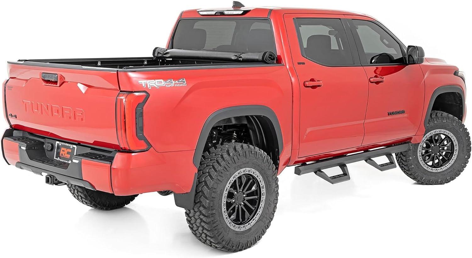 Upgrade your Tundra with Rough Country’s SRX2 Aluminum Side Steps, the perfect blend of innovative functionality and rugged style. Featuring a unique slotted rail system, these cast aluminum hoop steps are fully adjustable, allowing you to slide the footpad left or right for the perfect position to hop in and out of your lifted truck. Built from premium aluminum with a durable flat black powder-coated finish, these steps are designed to resist rust and wear, ensuring long-lasting performance both on and off the road. Not only do they enhance functionality, but they also improve your truck’s aesthetics by concealing unsightly body pinch welds and frame components.