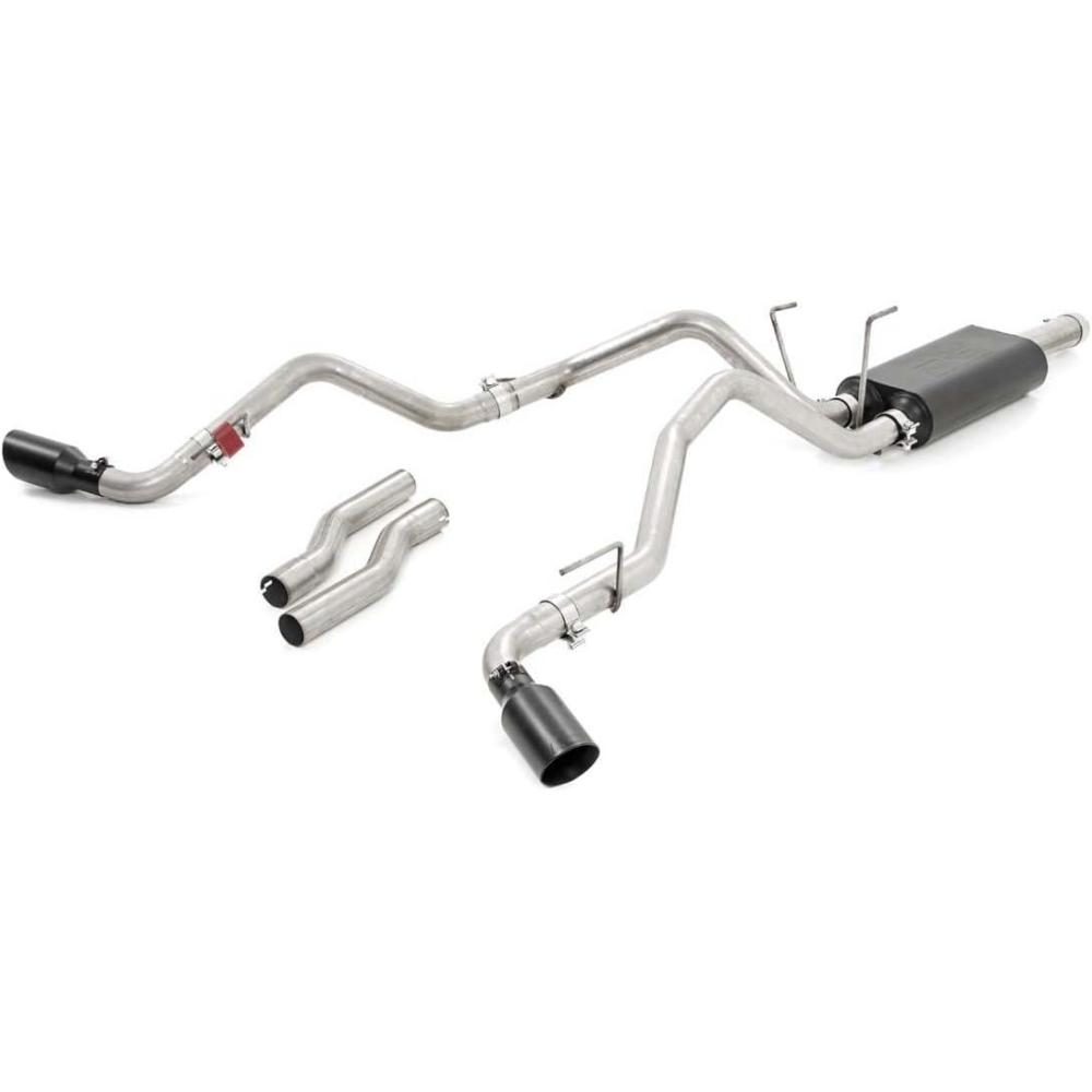 Give your truck an aggressive, throaty growl and killer good looks with Rough Country’s Dual Cat-Back Exhaust System for Dodge Ram 1500 models. These durable exhaust systems are fine tuned to improve air flow and deliver and the perfect aftermarket exhaust note that will put a smile on your face every time you hit the gas. Each kit features a set of high-temp resistant, dual-wall 304 black stainless tips with RC logo for an improved, aggressive look. Upgrading your exhaust note has never been easier! Each kit conveniently installs onto the factory hangers and features stainless clamps for easy assembly with no welding required! Note: only Fits V8 Engines This part does not affect vehicle emissions and therefore is not covered by emissions regulations.