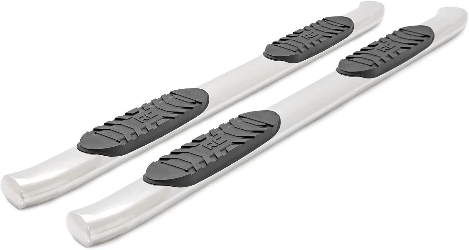 Give your truck the perfect finishing touch with Rough Country's Oval Nerf Step Bars. They feature non-slip foot pads for secure footing with a classic OEM design that looks great on any truck, including lifted models. These step bars are designed for both form and function with a curved and stylish look.
