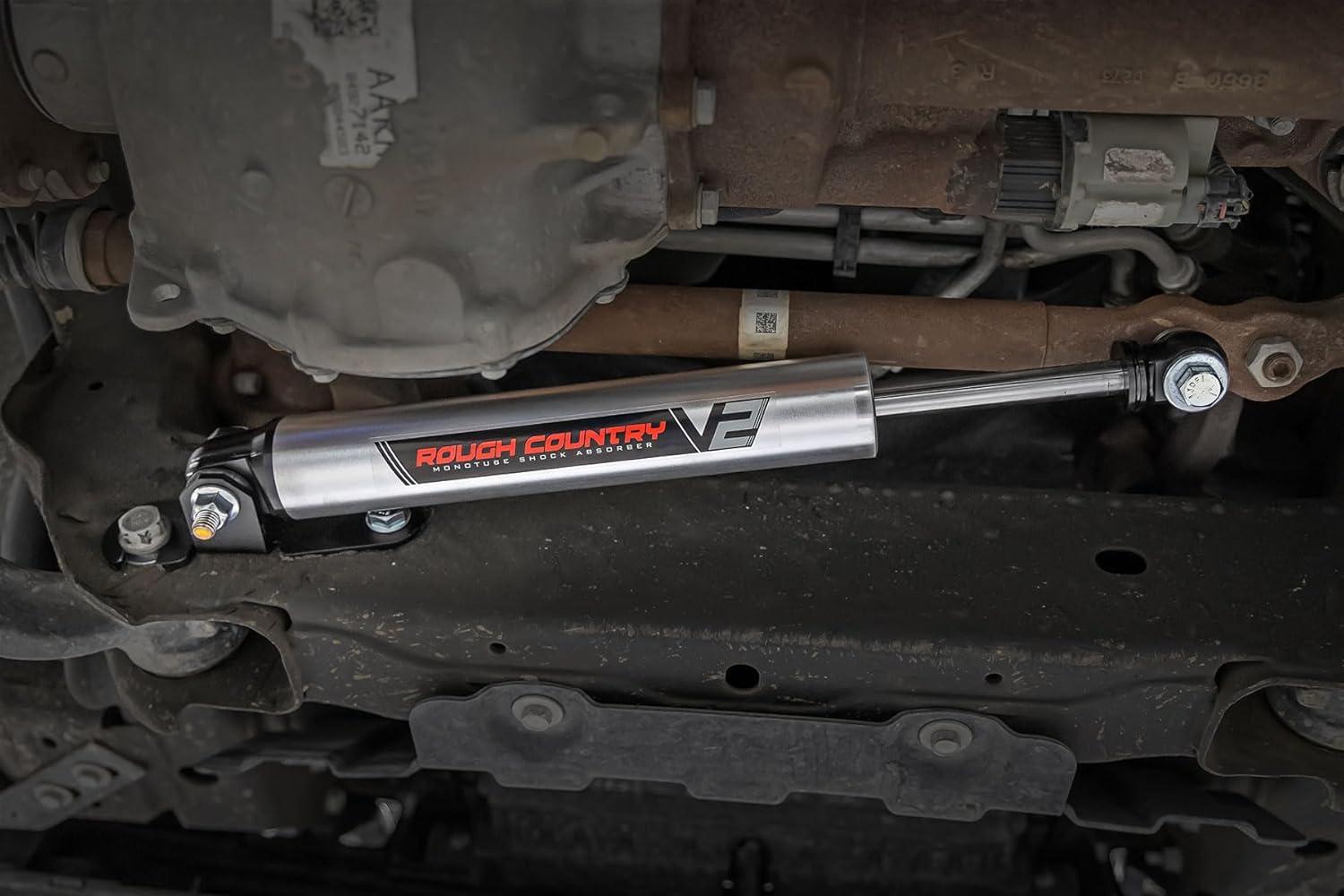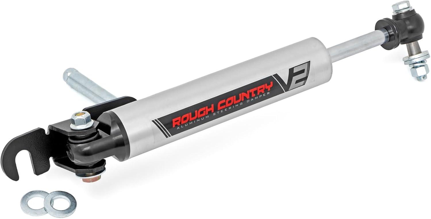 Superior Design and Comfort. Give yourself peace of mind when upgrading to a larger wheel and tire set up with Rough Country's V2 stabilizers! Steering stabilizers are designed to restrain “bump steer” and front-end vibration, giving added life to tires, ball joints, and other steering components. Rough Country's V2 stabilizers improve the overall driving experience providing precise dampening raising the vehicle's overall comfort and functionality.