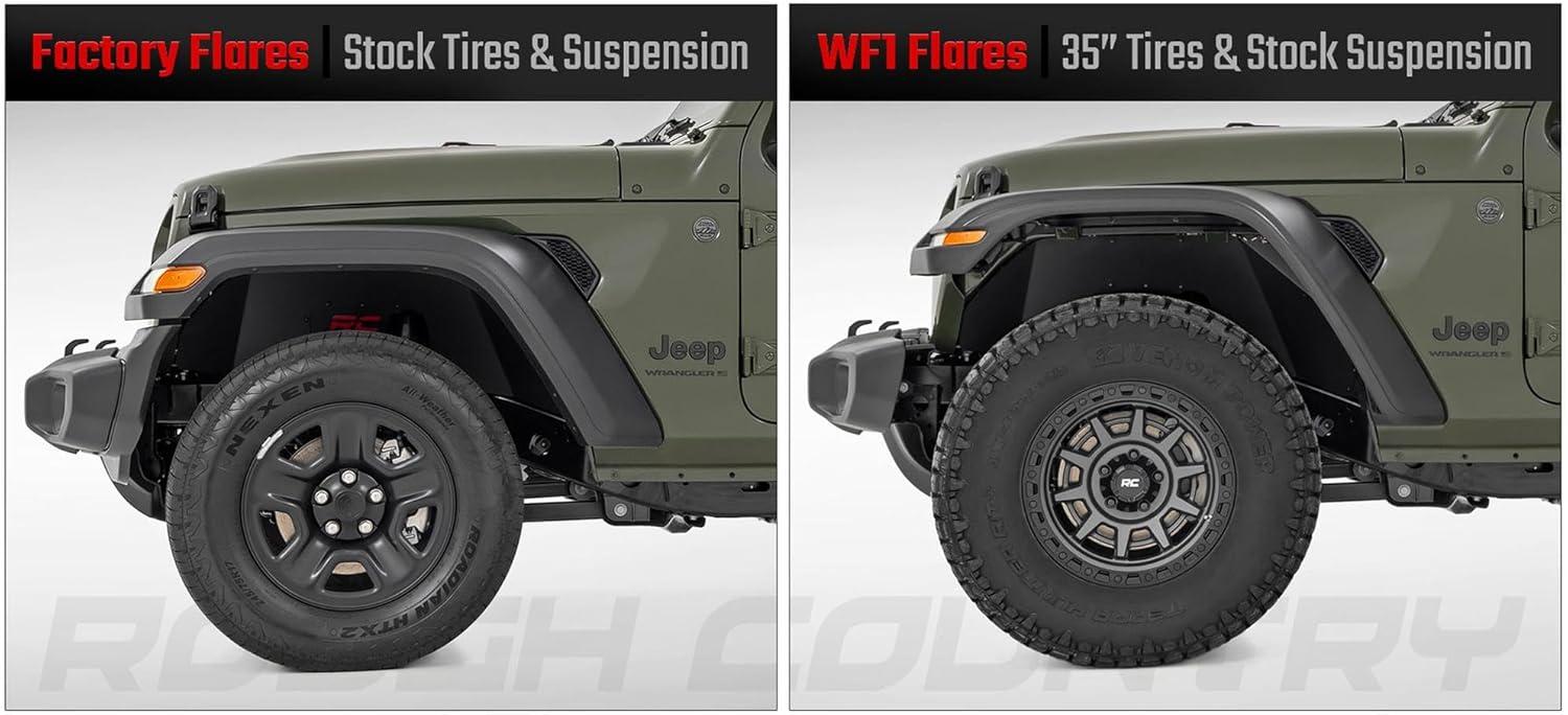 Innovative Design. It’s time to stand out from the crowd and rise above your peers. Increase your truck's tire coverage with Rough Country's WF1 Flares for the Jeep Gladiator. These aggressively good-looking flares transform your JT's exterior boasting an additional 3/4″ of tire clearance. These uniquely designed flares are sure to protect your JT's body from mud or road debris kicked up by the tires.