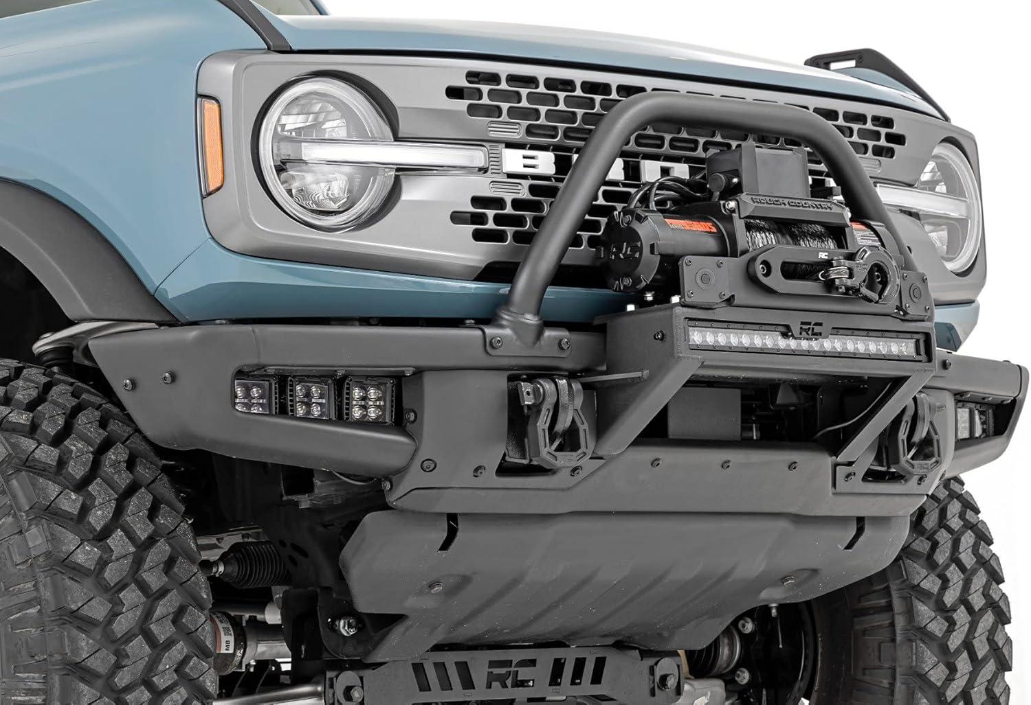 Superior Looks. Looking to take your off-roading game to the next level? Then you need a High Winch Mount! This bad boy works with factory steel modular bumpers for your Ford Bronco and allows the installation of 9500lb or larger winches – perfect for those who like to live on the wild side. Our High Winch Mount also includes an optional 20-inch light bar so you can see what you're getting into. So whether you're an experienced off-roader or just looking to take your adventures to new heights, the High Winch Mount is a must-have! Heavy Duty Construction. This mount is engineered for heavy-duty use, with a 1/4″ thick mild steel winch tray and mounts. It also includes 1/4″ thick spacers to clear factory tow hooks to install your winch above the factory steel modular bumper. The Bronco High Winch Mount also keeps your adaptive cruise control system in working order, so you can enjoy all the benefits of off-roading without sacrificing safety or style. With this mount, you'll be able to take on any terrain with confidence! Installation and Warranty. Rough Country's High Winch Mount includes installation instructions and necessary hardware. In addition, this product is backed with a limited lifetime replacement warranty for manufacturer defects. As such, the product is protected from structural and workmanship damage after the date of purchase. With our industry-leading warranty, give yourself peace of mind when using Rough Country's products!